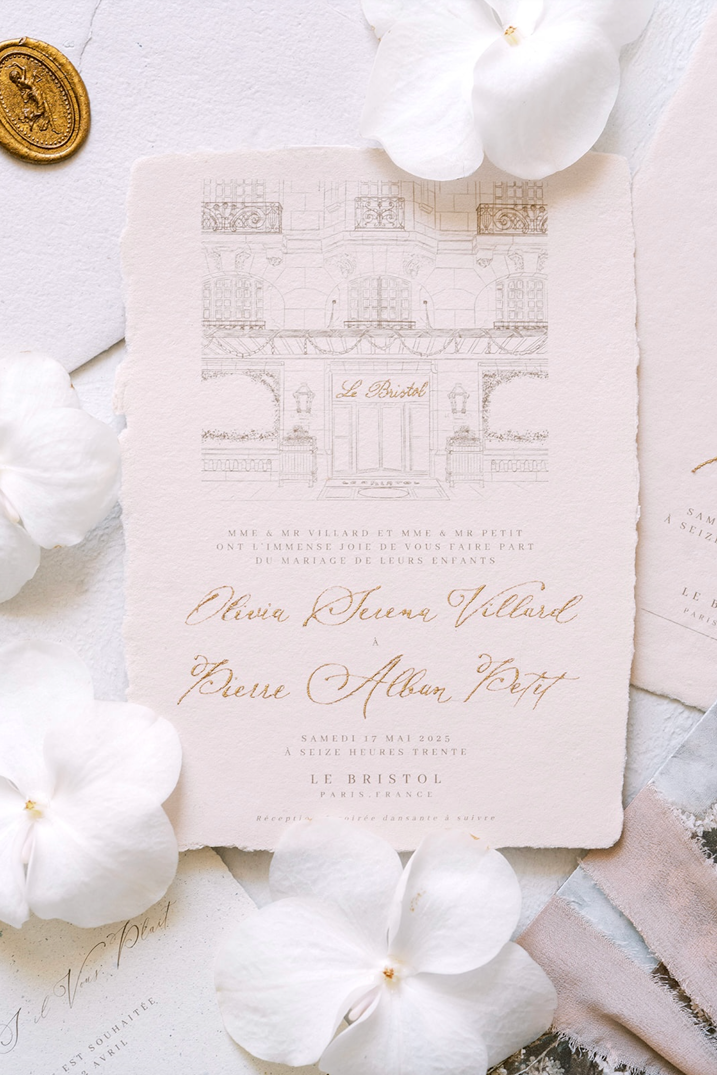 Découvrez notre exceptionnelle option d'embellissement pour votre suite de faire-part : Une illustration personnalisée du lieu de votre évènement. À l’aide d’une photo, nous créons une illustration unique, dessinée à la main, qui est ensuite numérisée pour être imprimée selon la méthode d’impression choisie. Cette illustration peut être parfaitement intégrée à votre invitation ou ajoutée à des éléments tels que des couvertures en vélin, des doublures d'enveloppe ou même votre papeterie du jour J. Accordez à vos faire-part une touche de personnalisation authentique qui donnera un avant-goût certain et captivera vos invités.